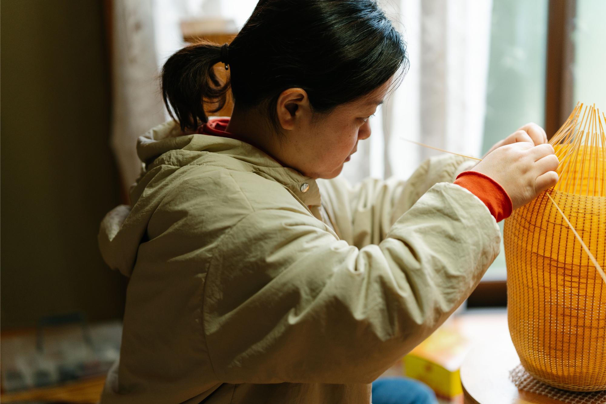 由布市のアトリエにて、自然や植物をモチーフとしたアート作品を制作しています。竹が持つハリのある素材感を活かした作品づくりの日々。自然との対話を重ね、四季や時間によって、さまざまに表情を変えるその姿を瑞々しく表現しています。